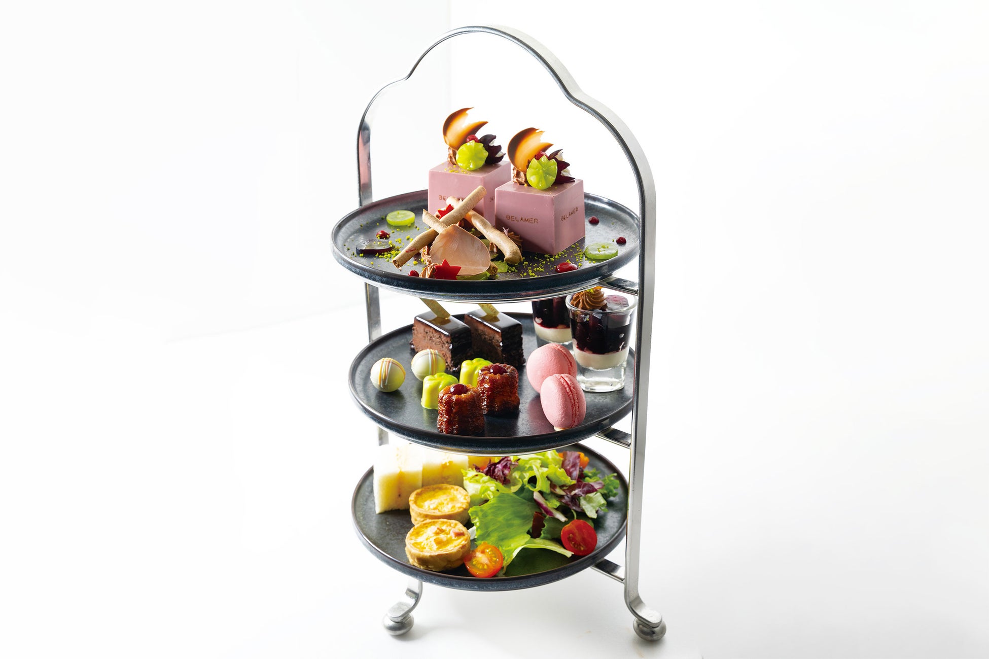 上段には、季節のデセール 巨峰とマスカットのミルフィーユ、ショコラ仕立ての枡をのせた華やかなアフタヌーンティーセット。