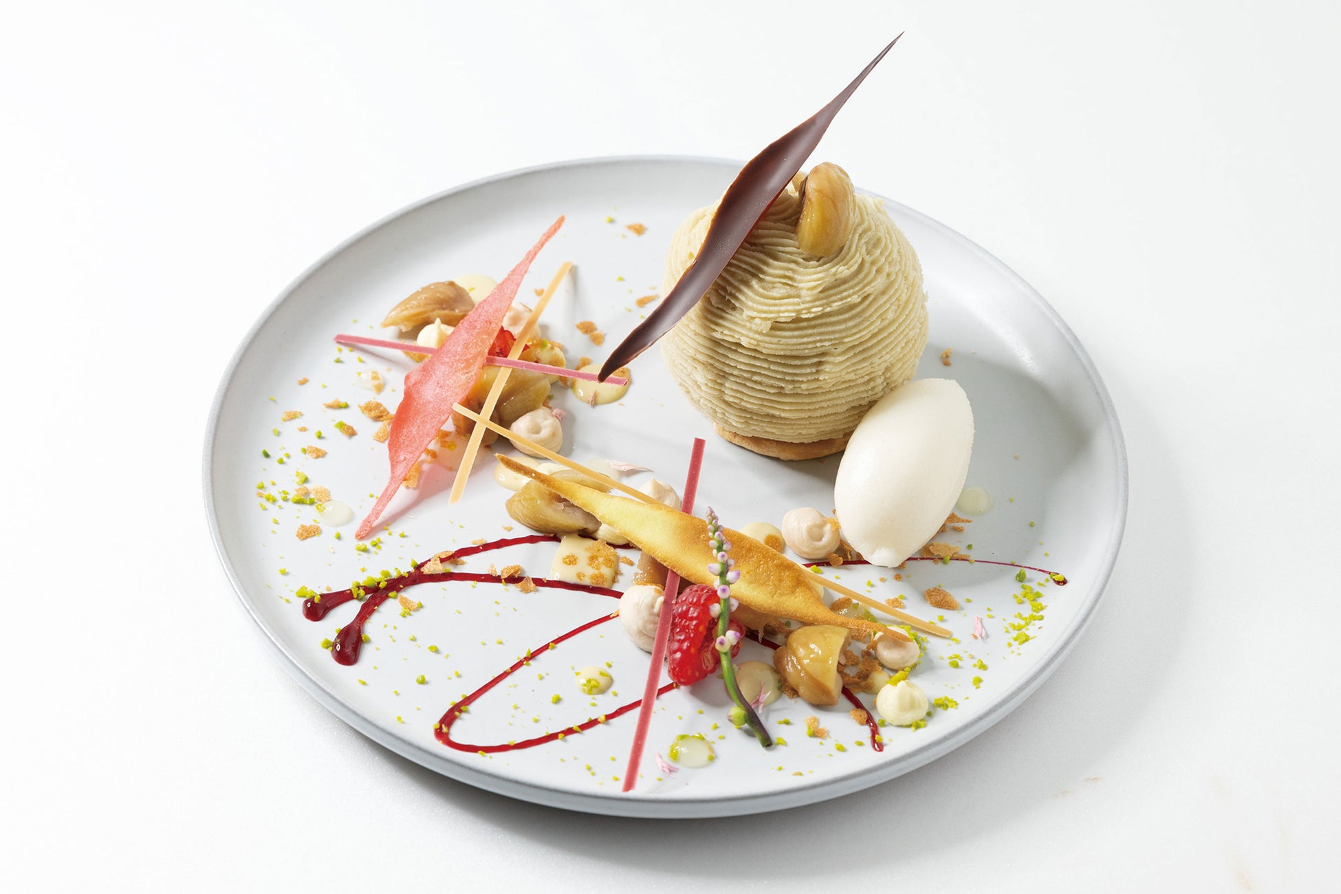 メレンゲの土台に洋梨とカシスのジュレを仕込んだマロン風味のホワイトチョコムース、周りにマロンのクリームを絞ったモンブラン。