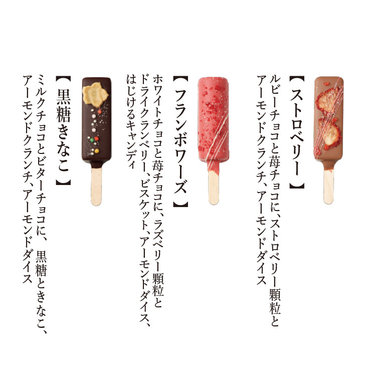 様々な素材を使用し、口どけ良く軽い食感に仕上げた、棒つきチョコレート。