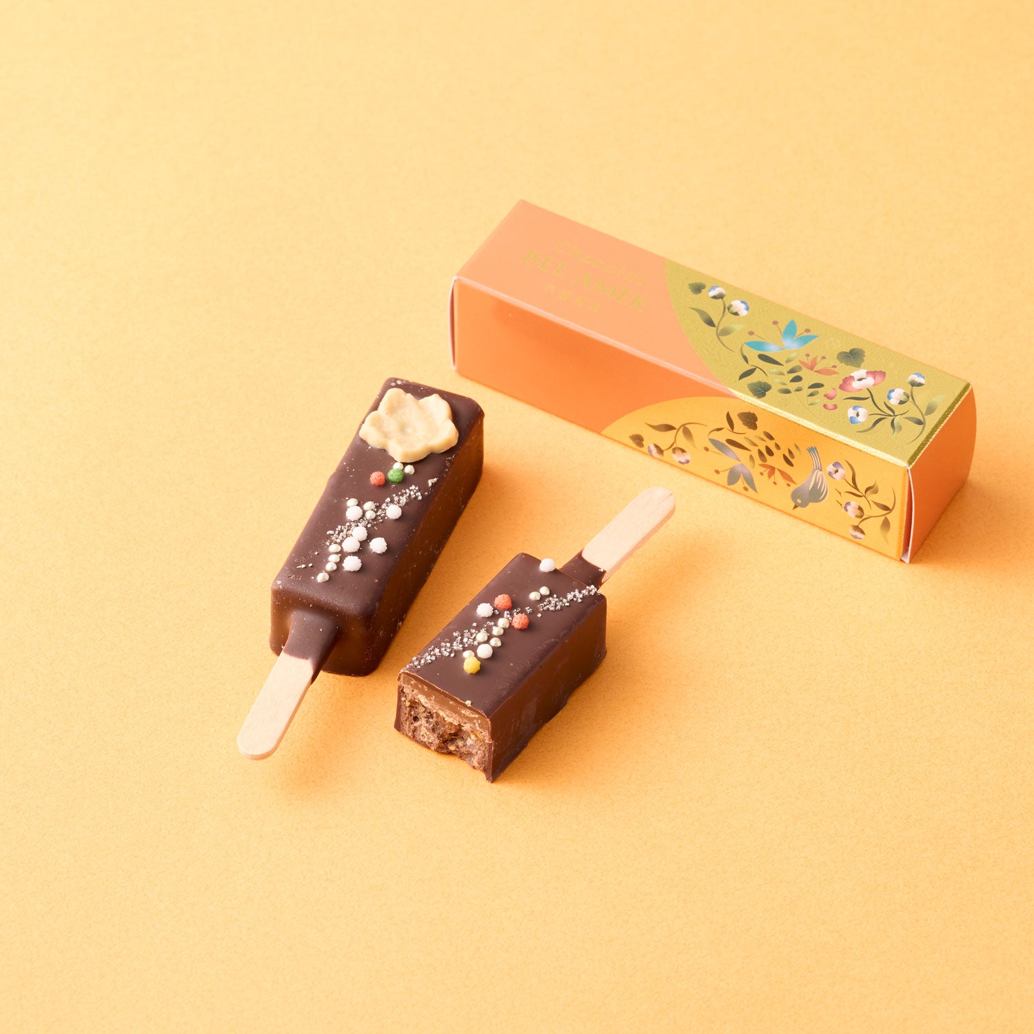 様々な素材を使用し、口どけ良く軽い食感に仕上げた、棒つきチョコレート。