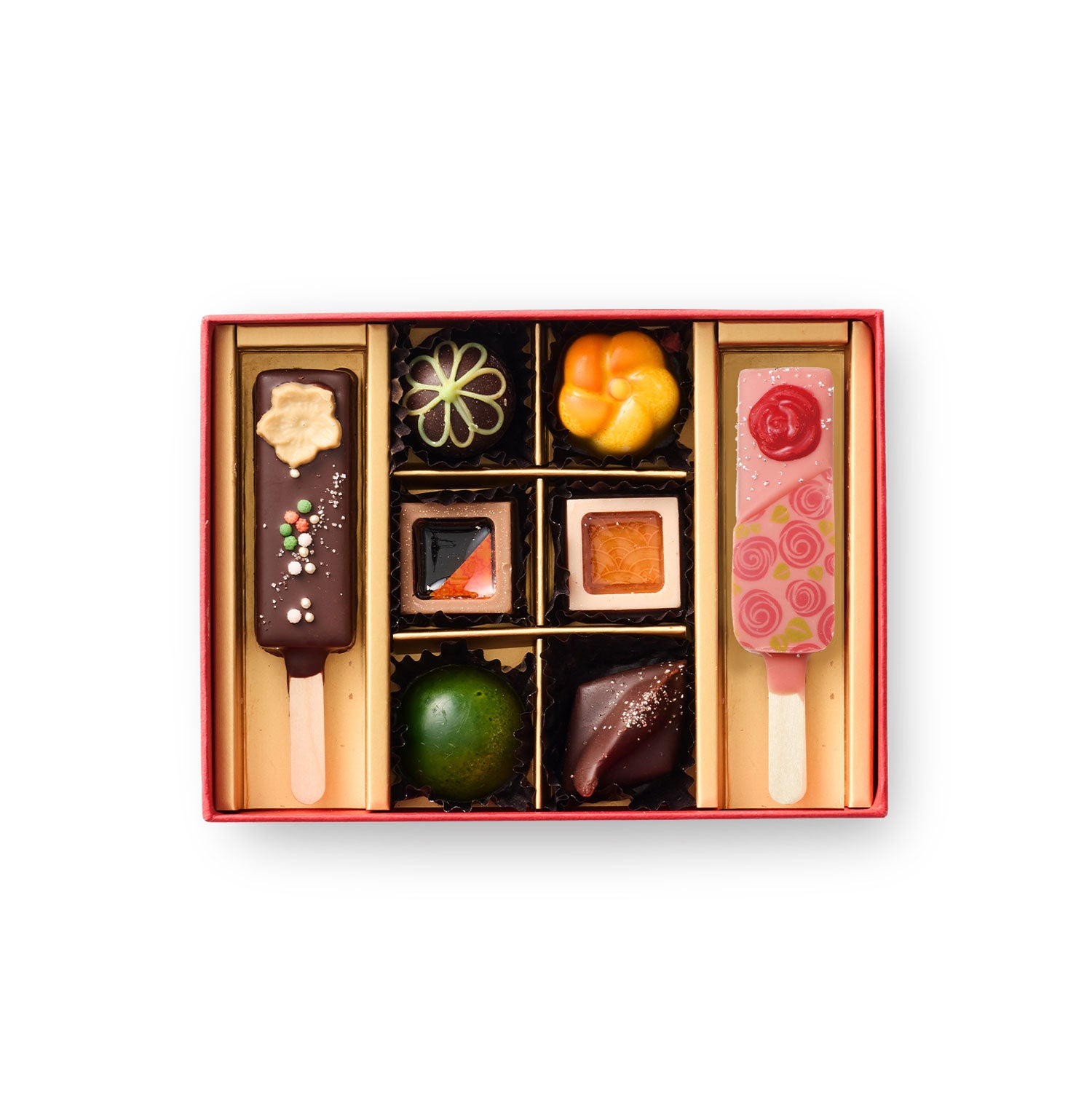 ベルアメール京都別邸のボンボンショコラとスティックショコラの詰め合わせ。