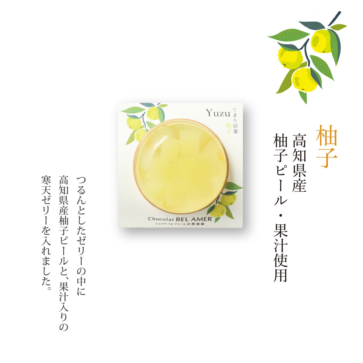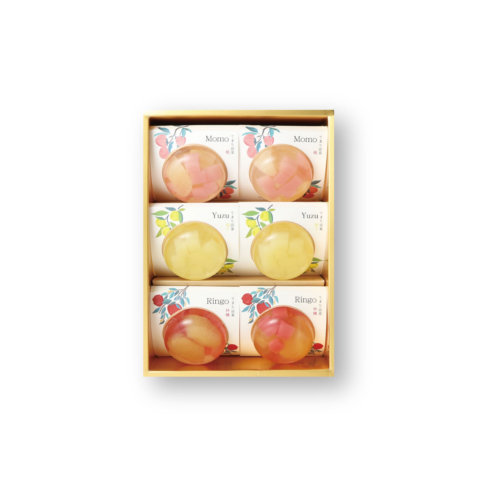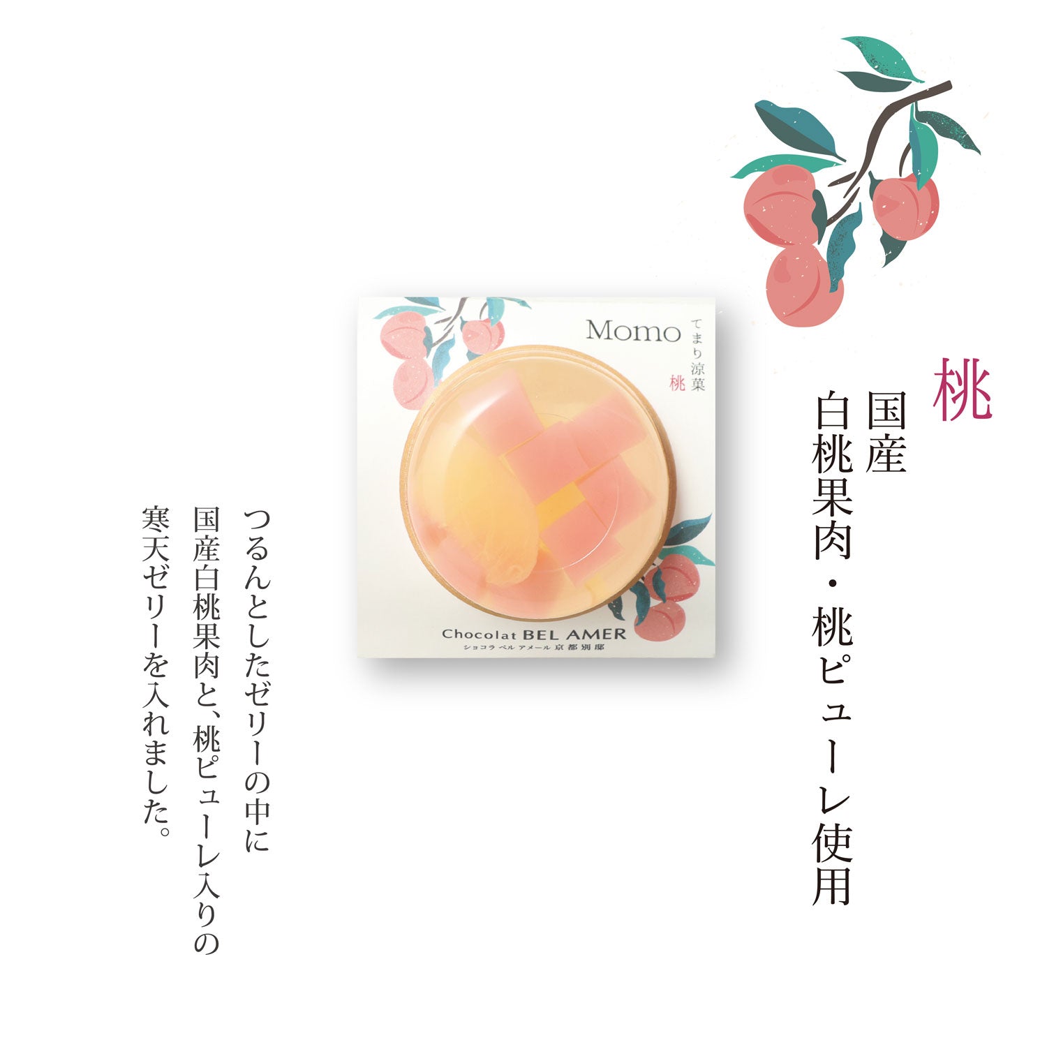つるんとしたなめらかな口あたりのゼリーの中に、国産の果肉やピール、果汁を使った寒天ゼリーを閉じ込めました。